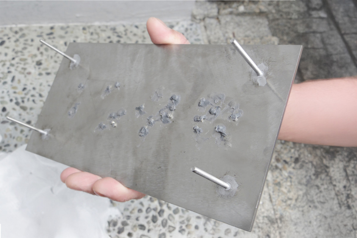 取り付け面の清掃と下地処理 古い接着剤や汚れを丁寧に取り除き、表面を平滑にします。古いネジ穴が隠れない場合は、外壁用のパテ(1,000円〜3,000円程度)で埋めて補修します。この下地処理が、仕上がりの美しさと耐久性を左右します。