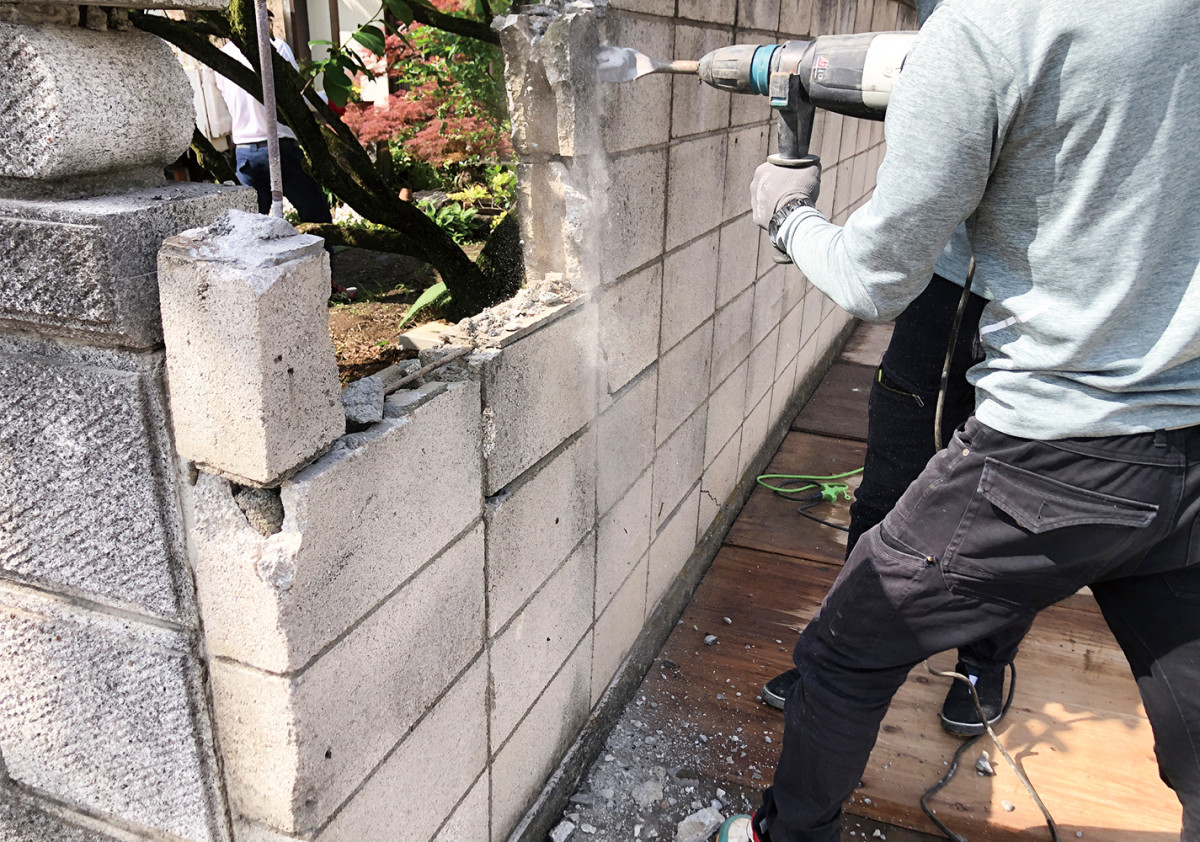 ブロック塀は、見た目以上に重量があり、1個あたり約10kg~15kgにもなります。安易にハンマーなどで叩き始めると、予期せぬ方向にブロックが崩れ落ち、作業者自身が下敷きになる重大な事故につながる恐れがあります。