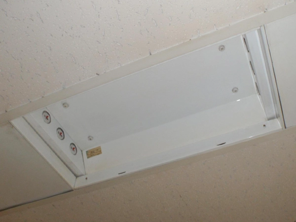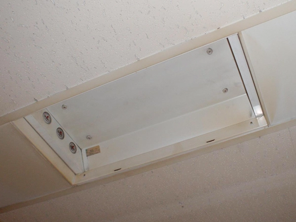| 高所照明 | 天井が高い場所に設置された照明器具の総称です。工場や体育館、倉庫など、高所から広い範囲を照らすためのライトが該当します。高い場所にあるため、点検や清掃には脚立や高所作業車が必要になることがあります。 照明カバー 蛍光灯や電球の周囲に取り付けられる覆い(カバー)です。光を拡散して眩しさを抑える役割があり、プラスチックやガラス製が一般的です。内部にホコリや虫が溜まりやすいため、定期的な清掃で明るさと衛生状態を保つことができます。 |