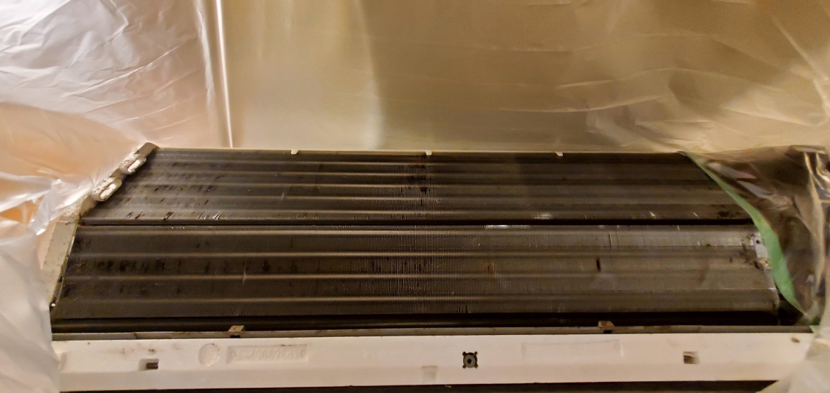 壁掛けエアコン(2018年製・型式F28VTES-W)のカバーとフィルターを取り外し、内部のアルミフィンや送風ファンに付着したホコリ・カビ汚れを専用洗剤とポンプで丁寧に洗浄しています。