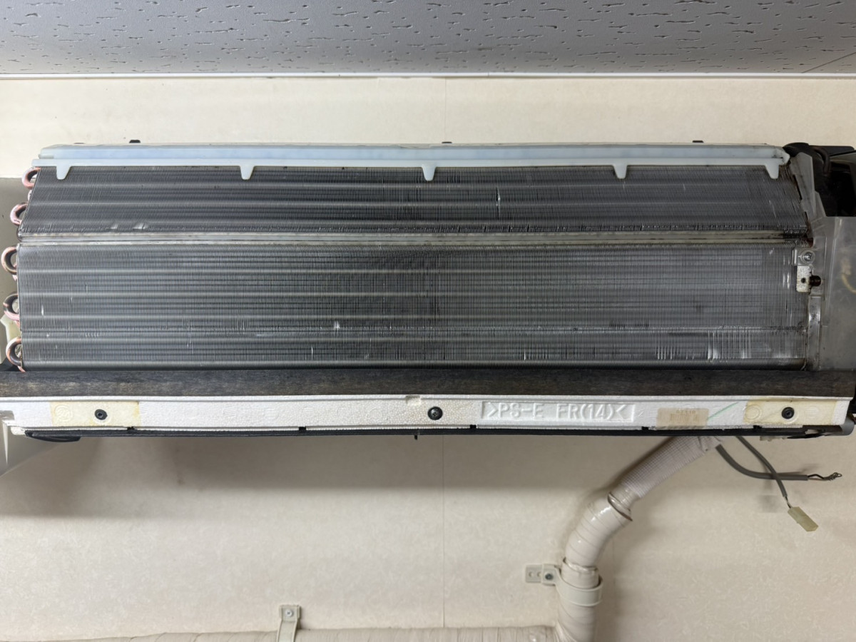 取り外したフィルターやカバーは院内の水場をお借りして洗い、乾燥後に元通り組み立てました。 - 続いて天吊りエアコン(2018年製・型式FHP80DG)についても同様に分解洗浄を実施しました。
