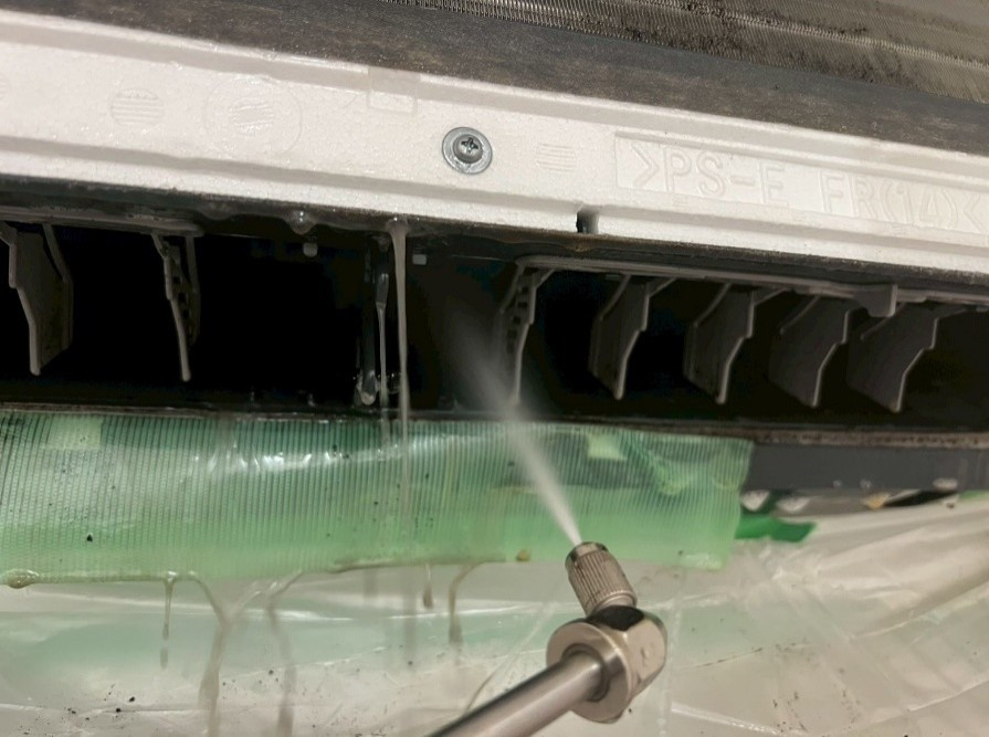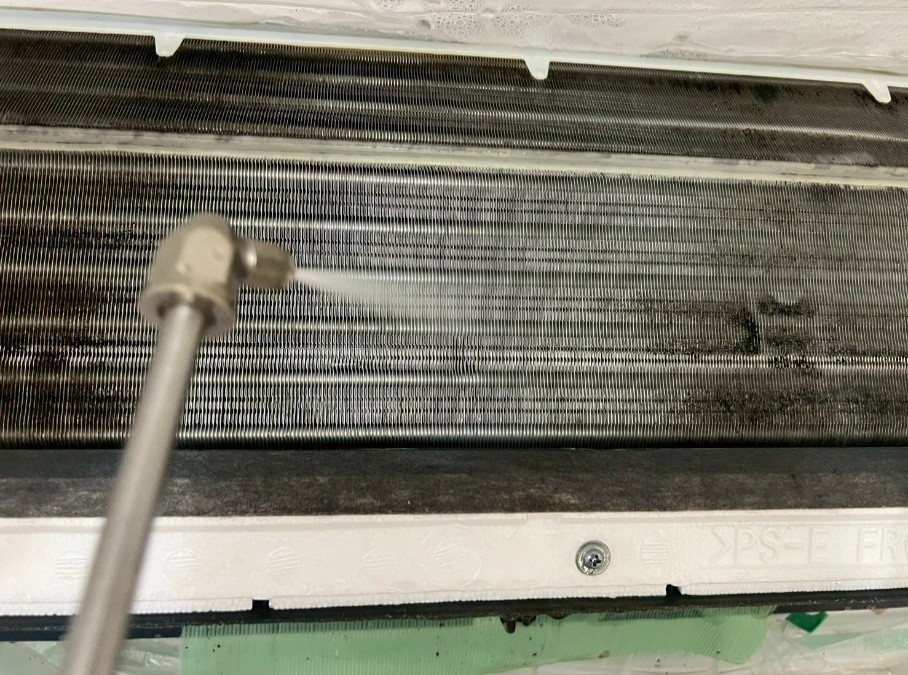 水圧だけで落ちにくい汚れには、エアコン洗浄用の洗剤を噴霧し数分置いてから再度洗浄しています。