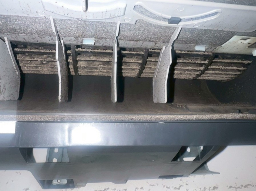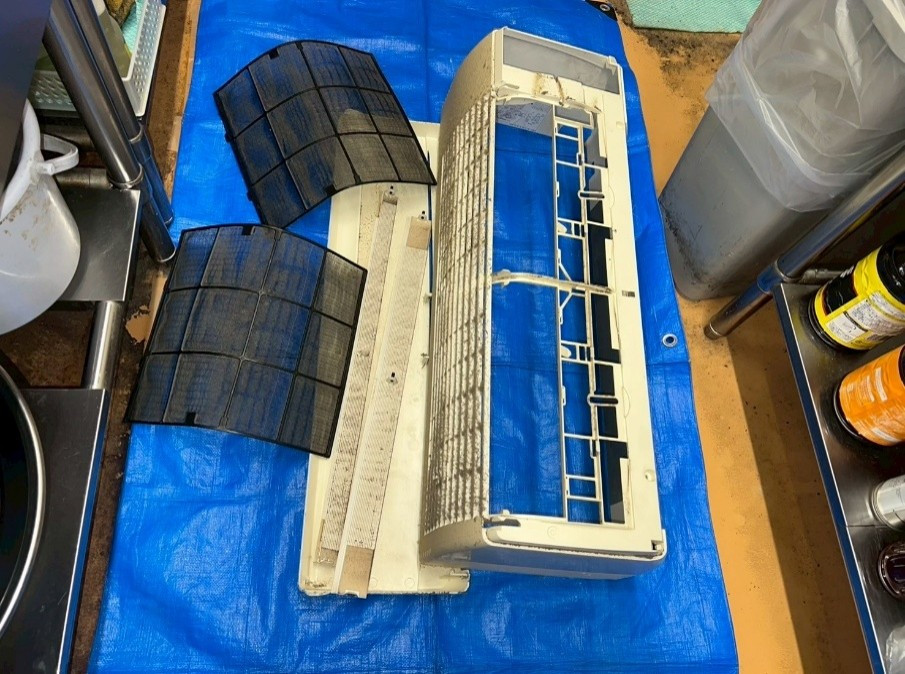 今回はパン屋さんのエアコン清掃で特有の細かな小麦粉の粉塵がフィルター全体に付着しており、一見フィルターが白く見える状態でした。