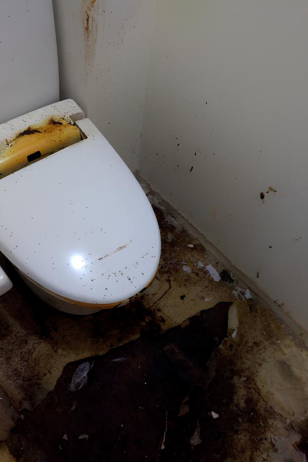 畳特有の青畳の色味が失われていました。 - トイレ:床一面がカビで真っ黒になり、便器の脚元まで汚染されています。