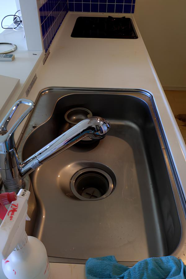 同時に床や壁が洗剤で傷まないよう、必要に応じて養生シートで保護しました。 - キッチン清掃(油汚れ・カビ除去)