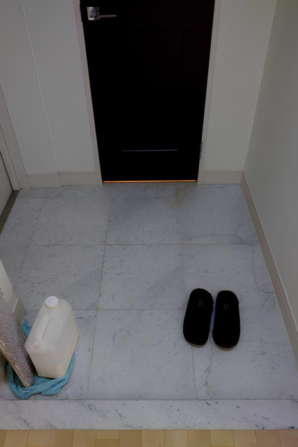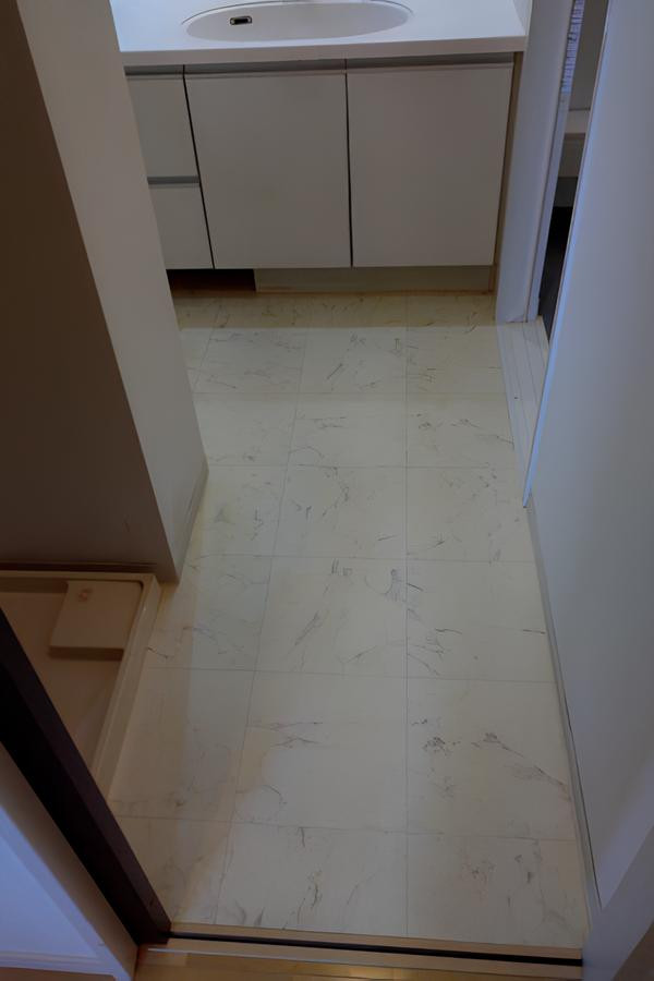 壁の下部にも尿の飛び散りによる黄ばみ汚れとカビが広範囲に見られ、不衛生な状態でした。 - 玄関・洗面所床:白い大理石調の床材ですが、汚れでグレーにくすみ、本来の光沢が失われていました。
