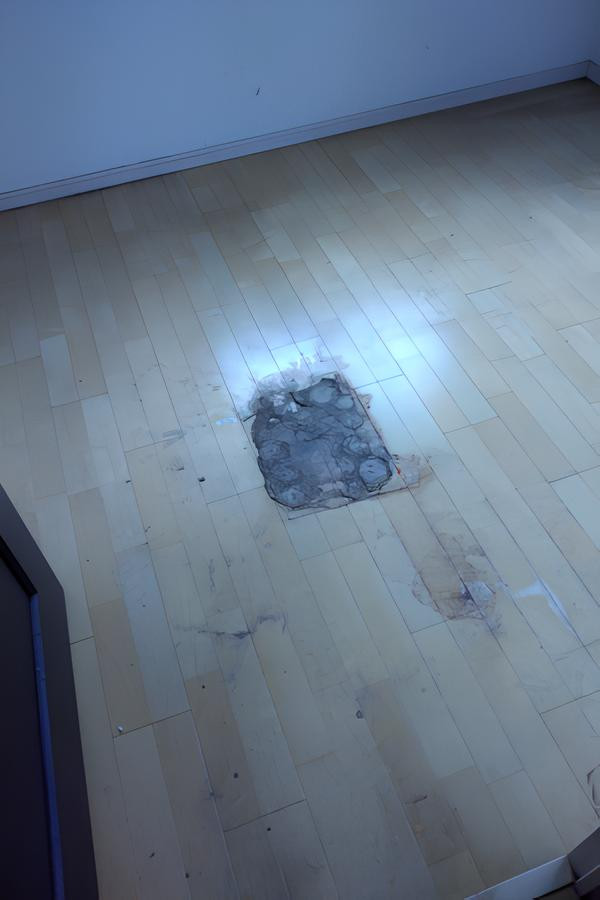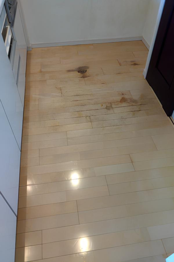 台の天板は赤茶色に変色しており、おそらくカビと一緒に金属製品からの錆汚れも付着していました。 - 居室(一部屋目・フローリング):床に四角い黒い汚れが盛り上がって固着していました。