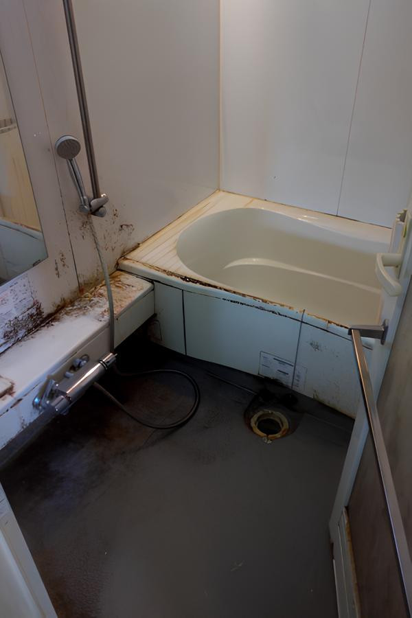 - 浴室:グレーだった床タイルが一面真っ黒なカビ汚れに覆われていました。
