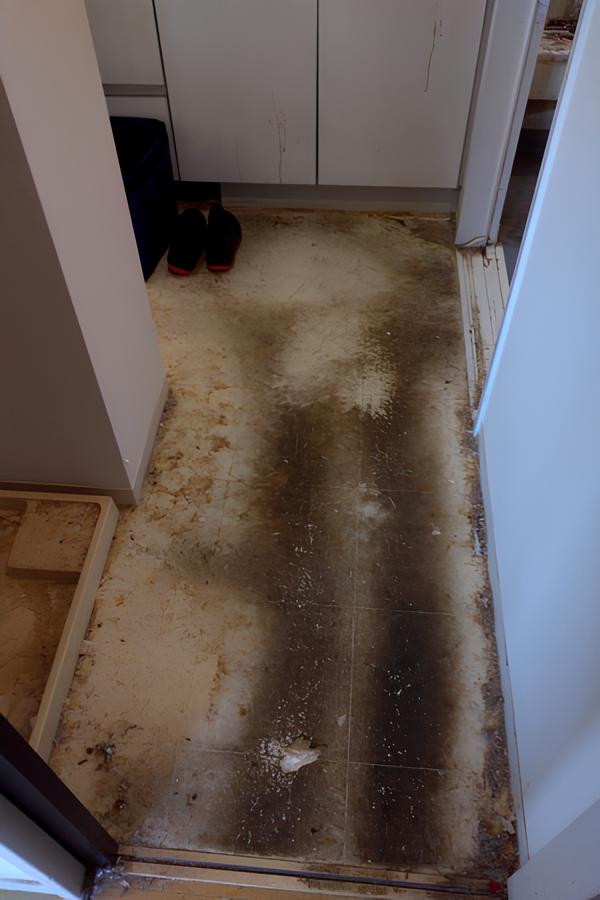 - 洗面所・廊下の床:フローリング表面が黒カビで覆われ、踏み板が黒ずんでいる状態でした。
