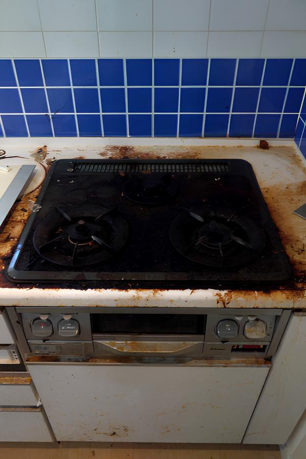 - キッチン:本来は白いシステムキッチンですが、扉や壁面には茶色い油汚れの垂れ跡が全面にこびりつき、所々に黒カビも発生していました。
