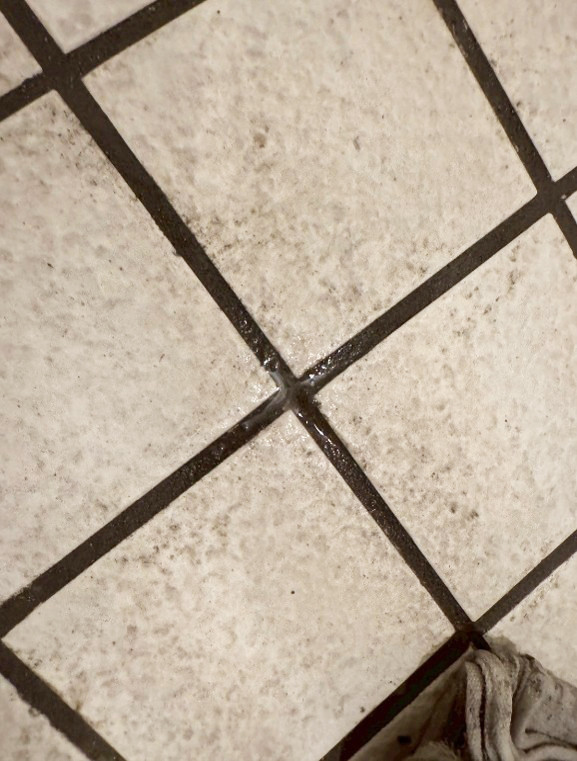 カビ取り作業と並行して、床タイル目地の補修(黒色目地の再生)も順調に進めました。