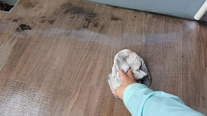 放置すれば美観を損ない衛生上も好ましくないため、消毒効果のある清掃用シートで丁寧に拭き取り、床面をきれいに復旧しました。