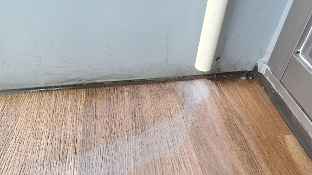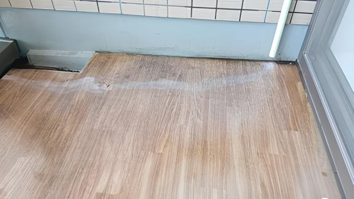 今回、原因の解消だけでなく、漏れ出た水による二次被害への対処も行いました。居室内のエアコン直下の床(木目調のフローリング)を見ると、以前の水漏れの痕跡である白い輪ジミができており、その周囲に黒いカビが発生しかけていました。