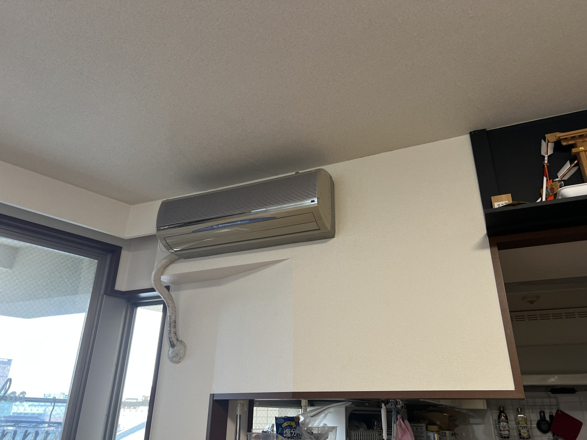 まず、旧SHARP AY-M28SC-Nの状態を確認。 見た目には動作しているものの、冷えが弱く・音が大きい。 さらに送風口周辺にカビ汚れがあり、配管カバー付近の結露跡も確認しました。 床・壁の保護のために全面養生を実施し、作業スペースを安全・清潔に確保します。