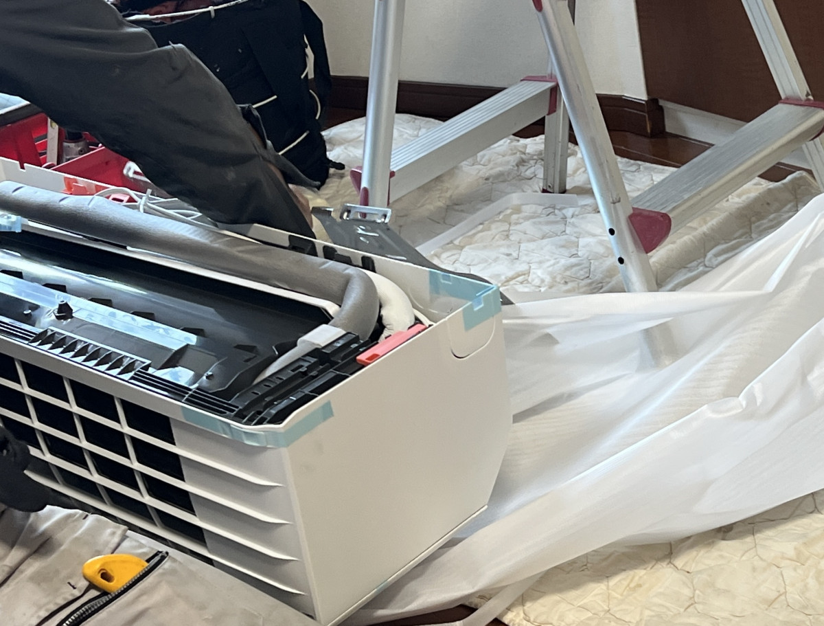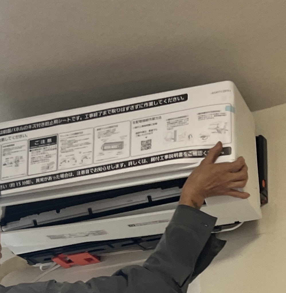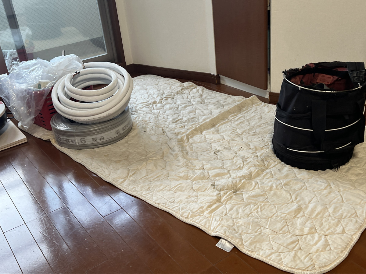 技術担当コメント:「エアコン工事って、実は“撤去よりも準備”が大事なんです。 とくに養生は最初の一手。ここをしっかり丁寧にやっておけば、床や壁を傷つける心配もないし、作業中のトラブルも起きません。最初の5分で、その日の仕上がりが決まるんです!」