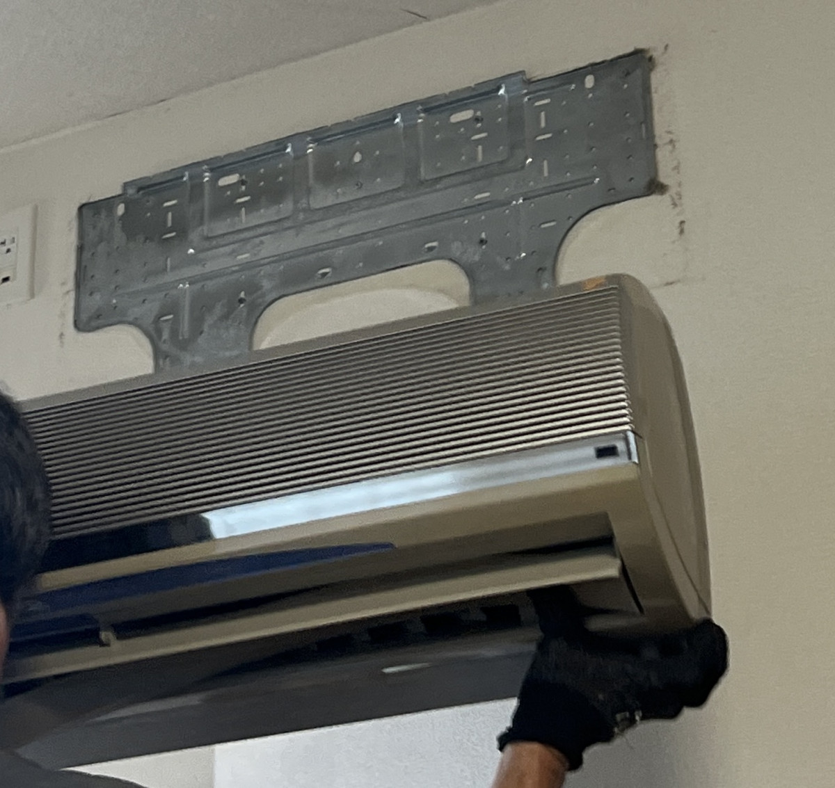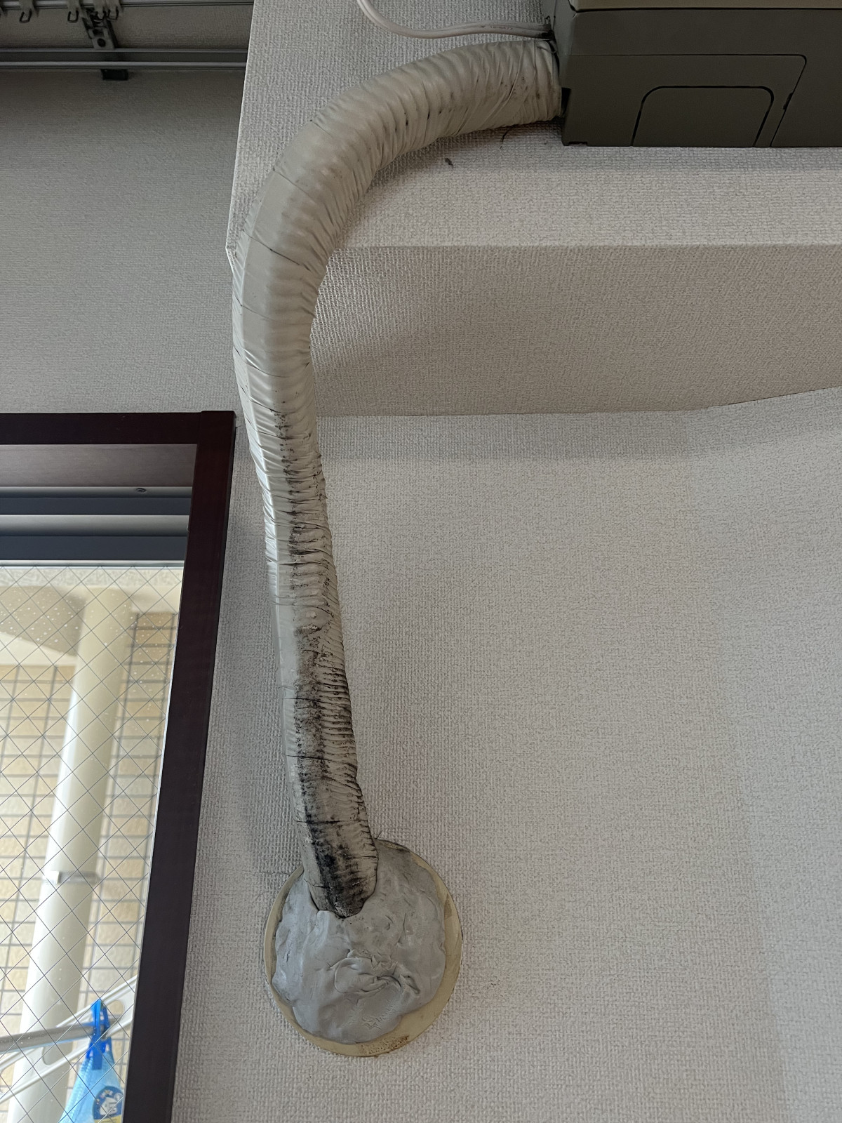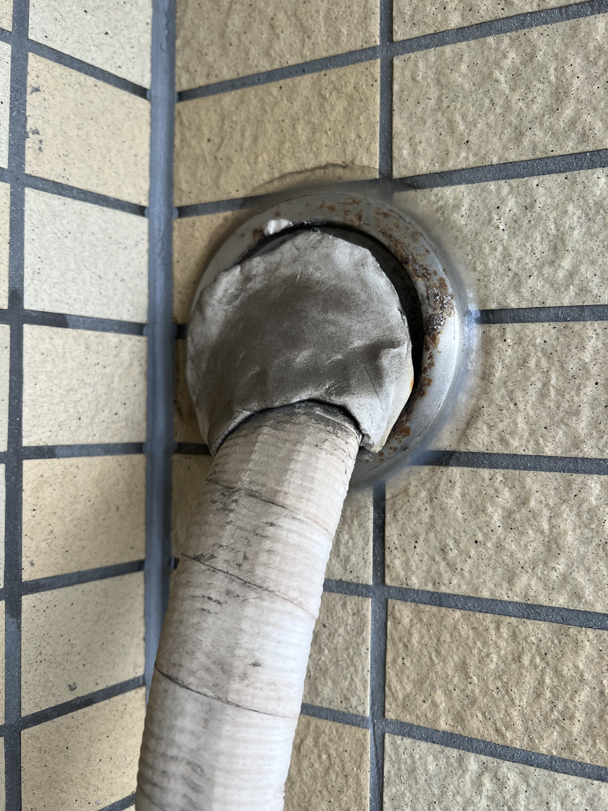 古いエアコンの配管まわりでは、冷媒管・ドレンホース・電源ケーブルをまとめた部分が、長年の少量の結露の影響でカビて黒ずみ、 外側の白い保護テープは経年劣化で破れてボロボロになってました。(画像2)(画像4) 外壁貫通部は金属カバーがサビており、断熱効果が失われていました。(画像3) 劣化したパテを専用工具で丁寧に除去し、次の新設に備えます。(画像10) 古い室内機を外すと、背面の壁(クロス)がホコリと黒ずみで変色していたので、マイクロファイバータオルと専用洗剤で徹底清掃し、新しい取付板の密着性を高めます。