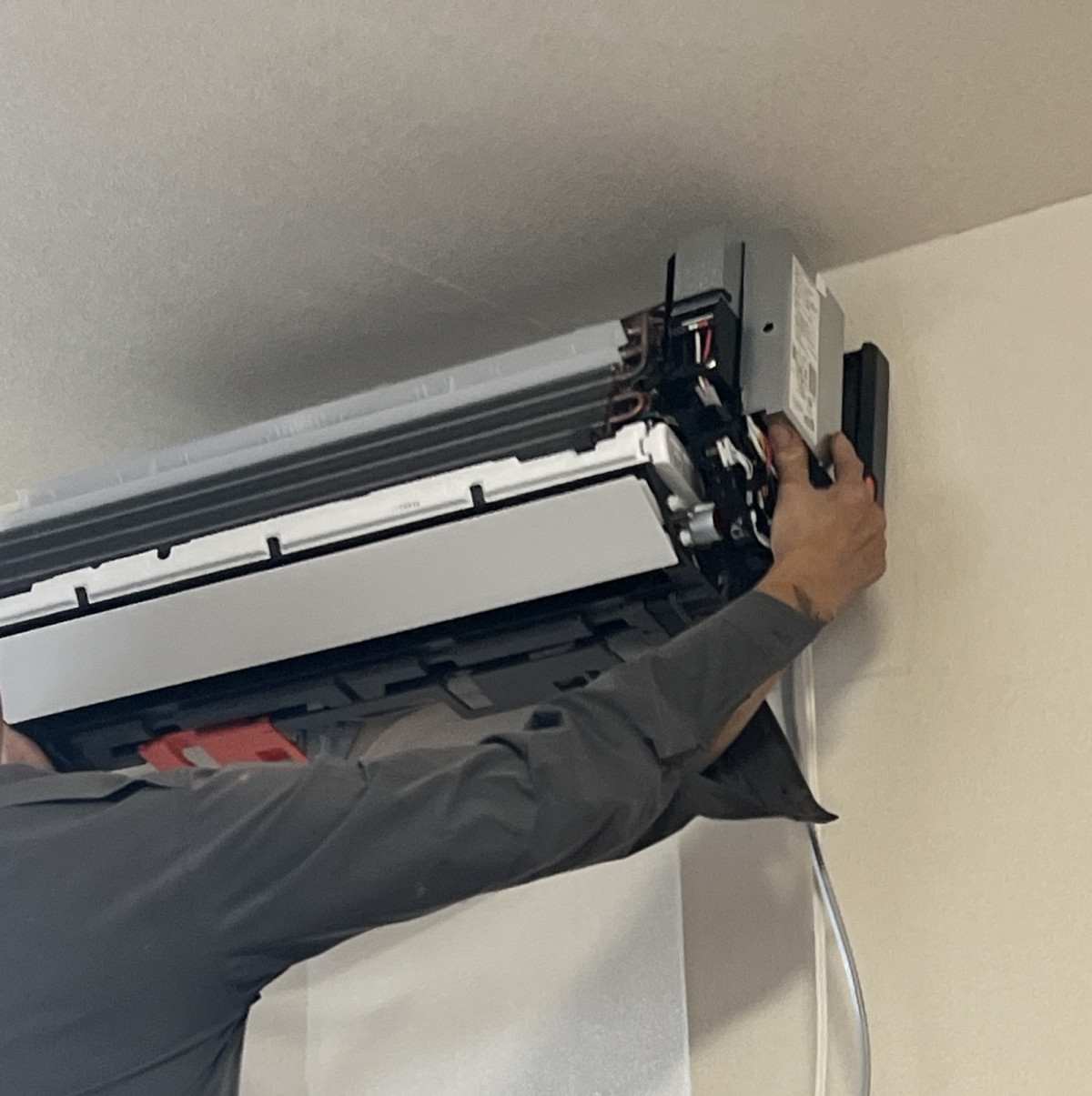 室内機を背板に正確に掛け、水平を再チェック。(画像16)