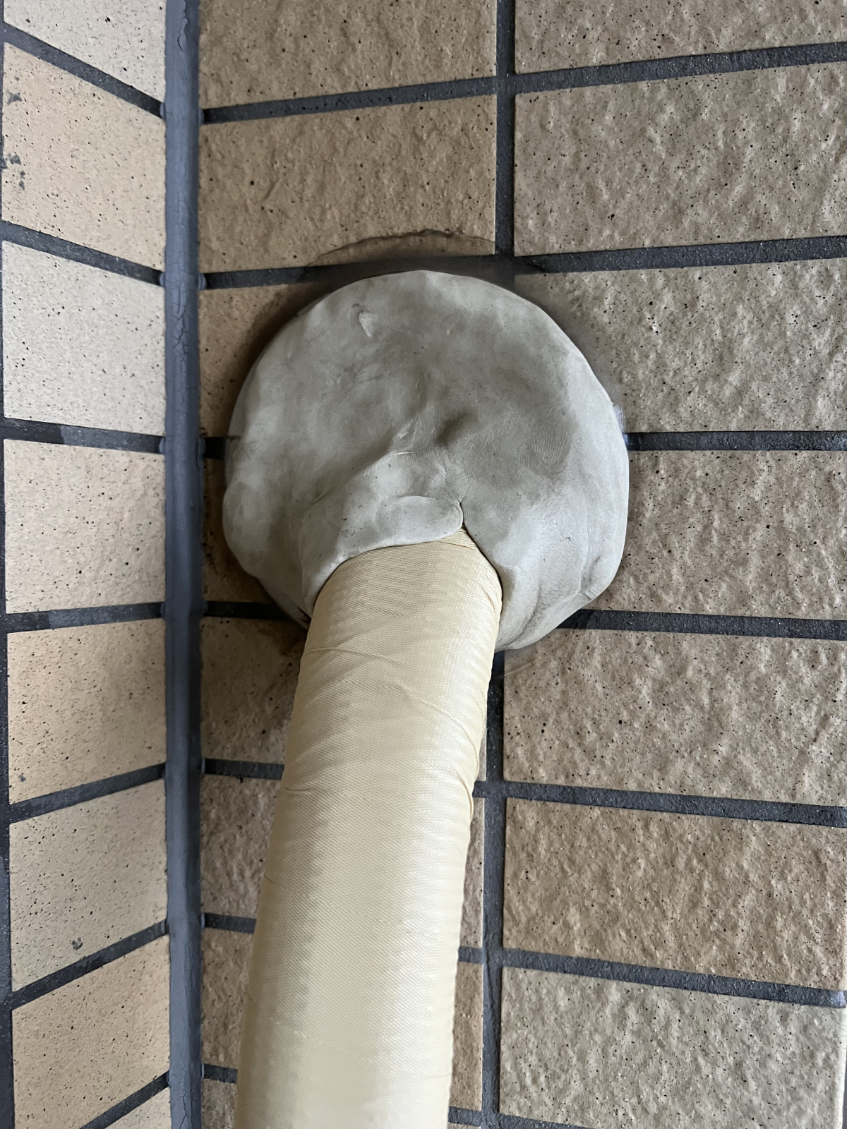 外壁貫通部は新しいエアコン専用パテで気密処理。(画像27)