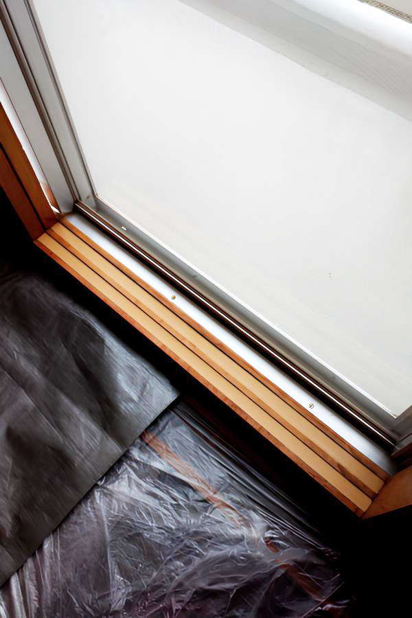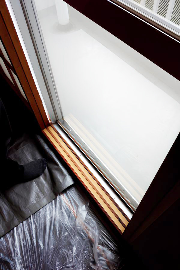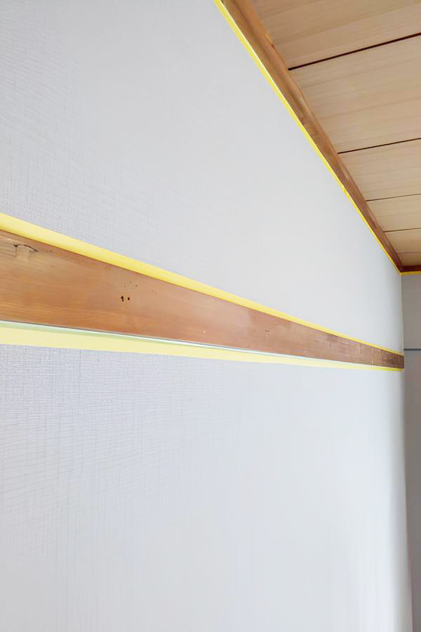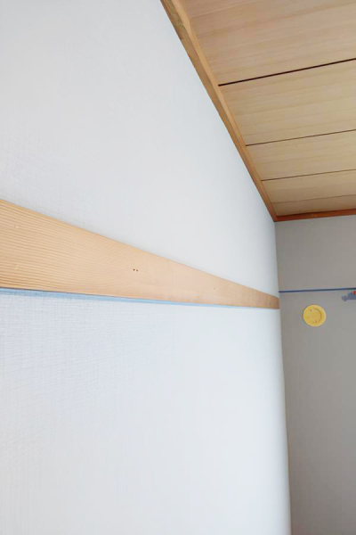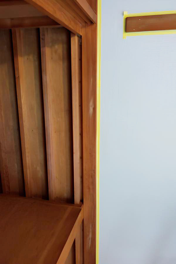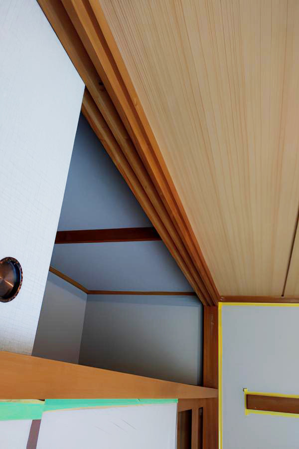 次に、木部の周囲をマスキングテープで覆い、特に壁紙(ビニールクロス)への薬剤付着を防ぎました。