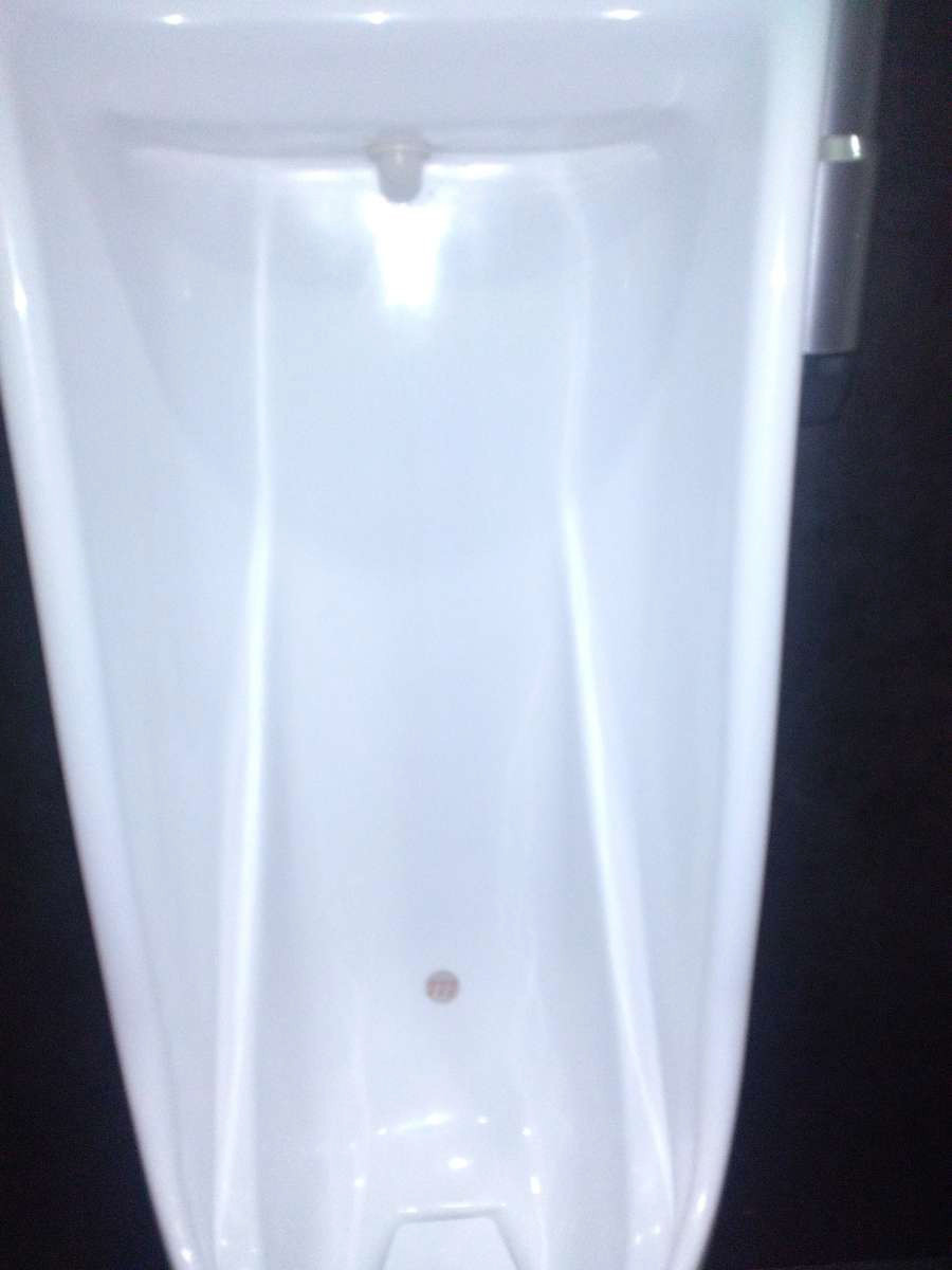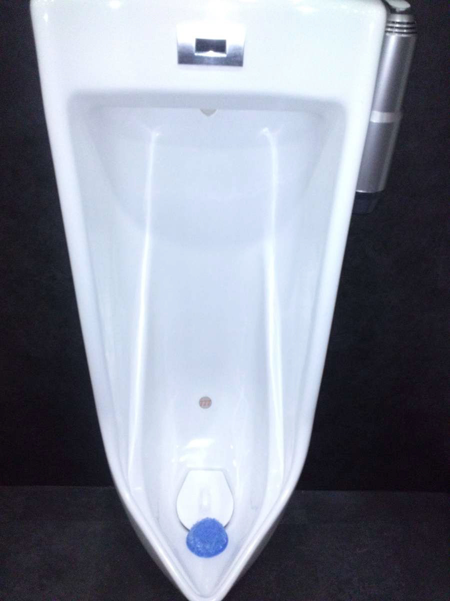 男性用トイレの小便器は尿石汚れや臭いが蓄積しやすいため、5基すべてに酸性の尿石除去剤を投入し、ブラシで念入りに擦り洗いしました。