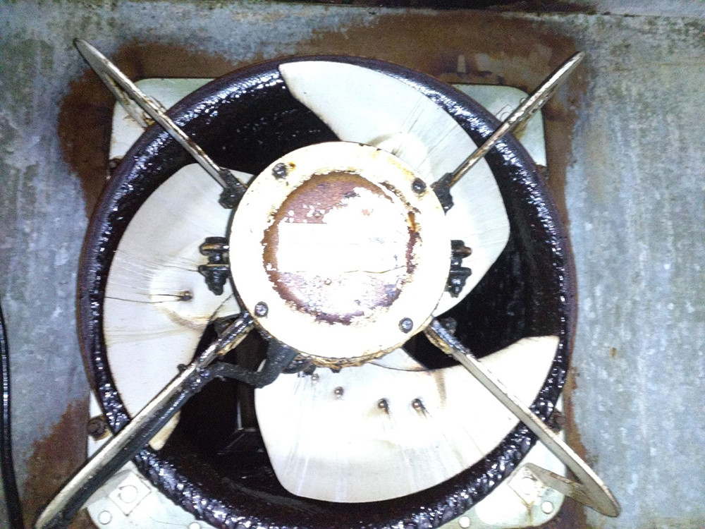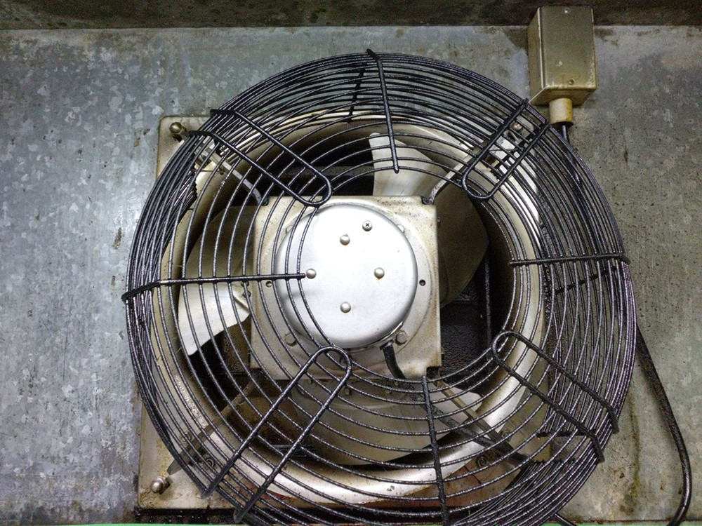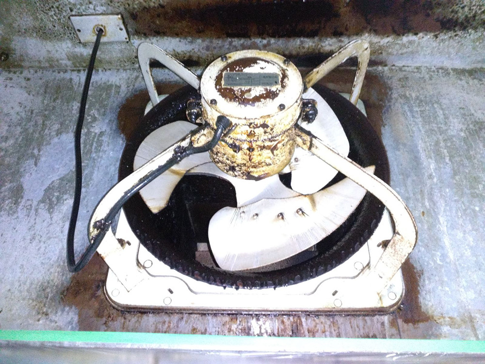 現地に伺って換気扇の状態を確認したところ、設置から年数の経った固定式の換気扇5基に厚い油汚れが地層のように蓄積しているのを目にし、正直その状態には驚かされました。