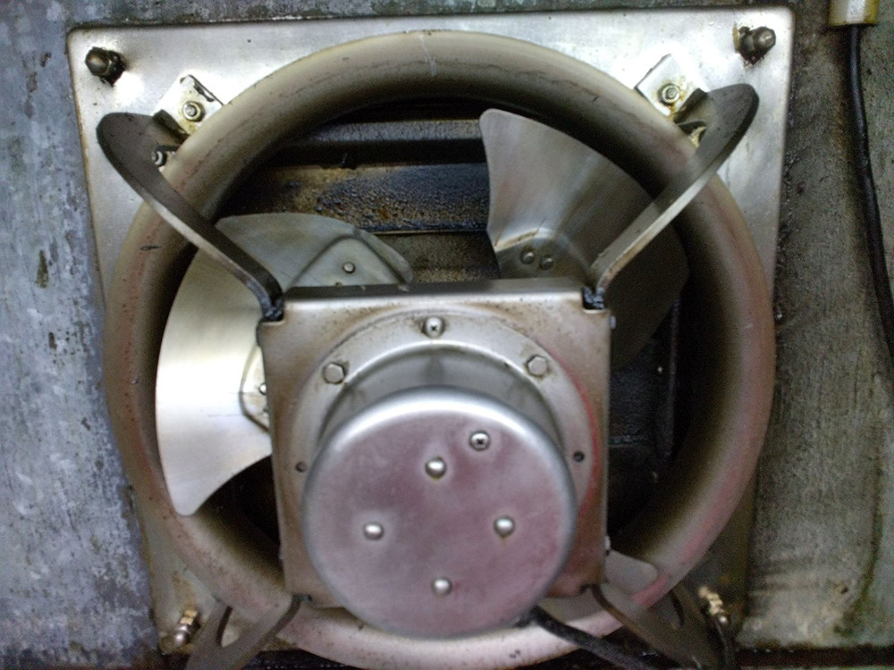 各換気扇では、油汚れが付着したバックガード(安全網)・プロペラ・ベルマウス(ファンの外枠)・シャッター(羽根奥の可動板)といった各部品を可能な範囲で洗浄しています。