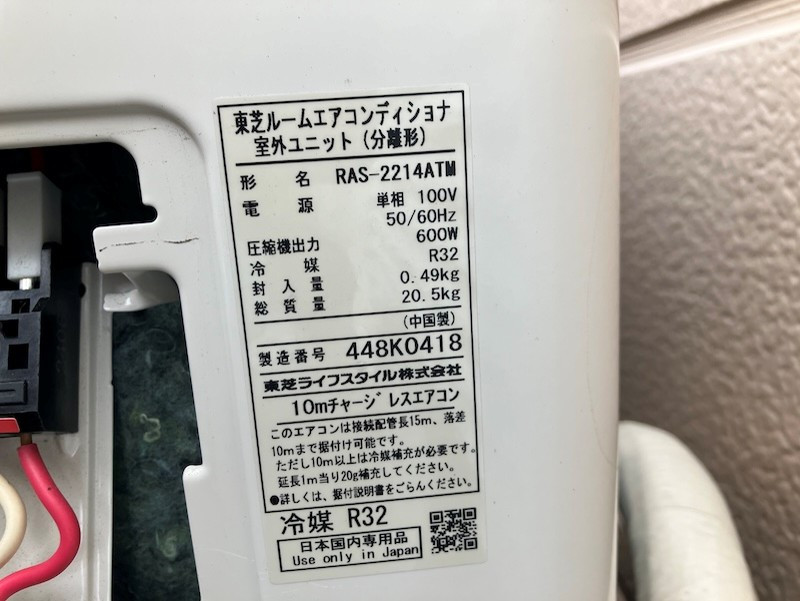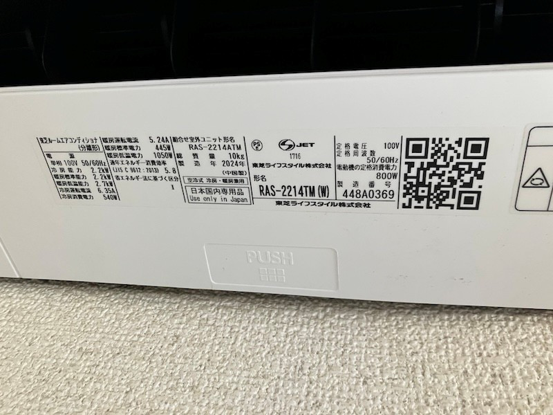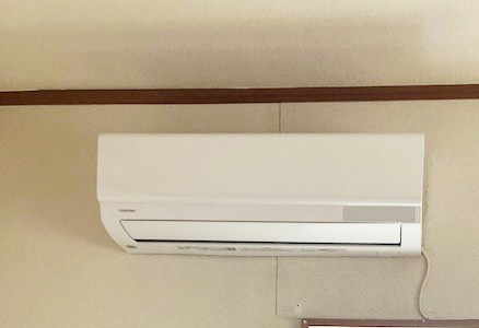 現場は2階建て建物の2階にある個室で、窓上の壁に東芝製ルームエアコン(型式RAS-2214ATM)の室内機が設置されていました。