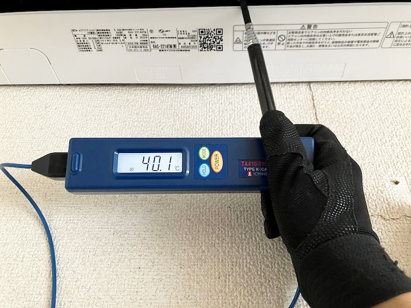 暖房運転を継続した状態で、室内機の吹き出し口から出る風の温度を測定すると約40.1℃まで上昇し、作業前に比べて明らかに温風の勢いと暖かさが改善しました。