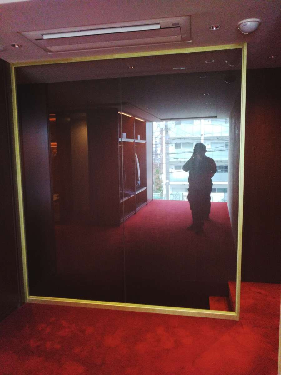 施工現場は、床一面が鮮やかな赤いカーペットで覆われ、さらに吹き抜け空間の壁は全面ガラス張りという特徴的な環境でした。