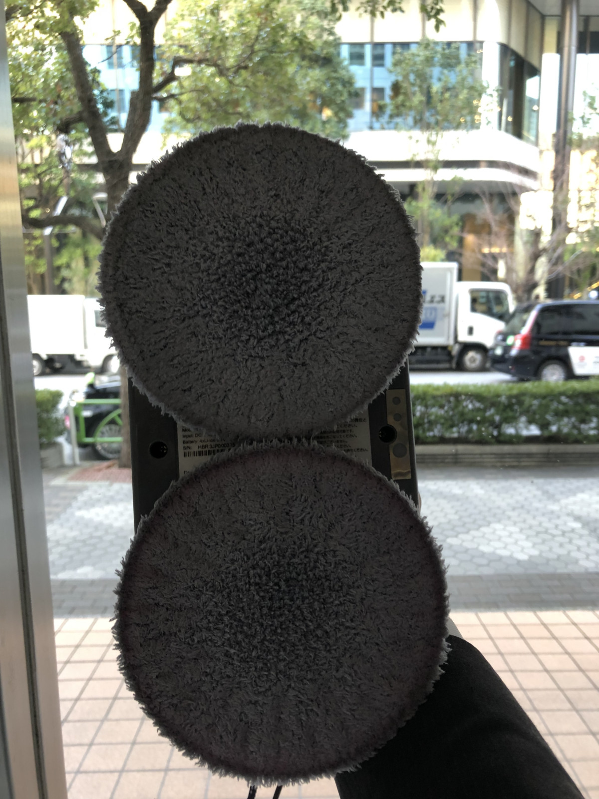 シャンパーで洗浄液を塗布しスクイジーで水切りした後、拭き残しやスクイジー痕が残らないよう、乾いたクリーンパッドで二度拭きして仕上げています。