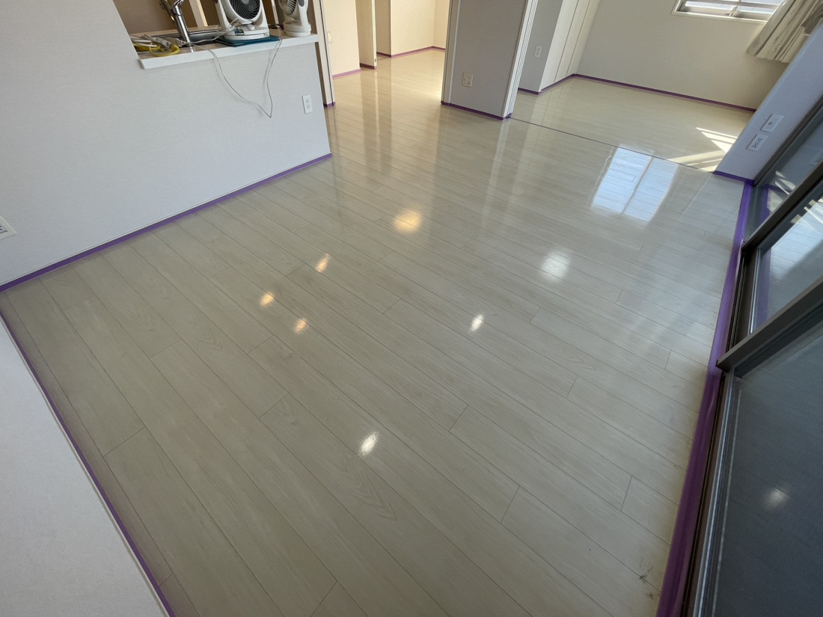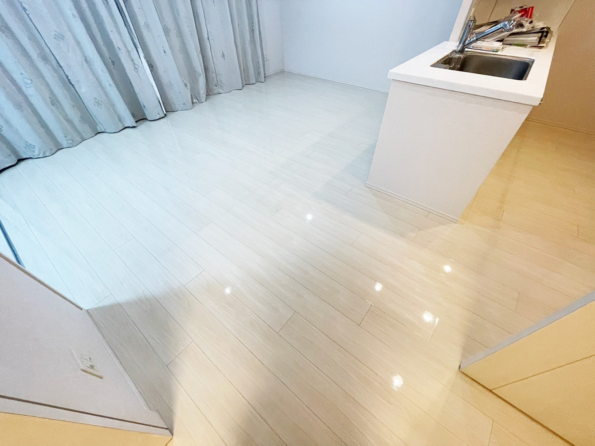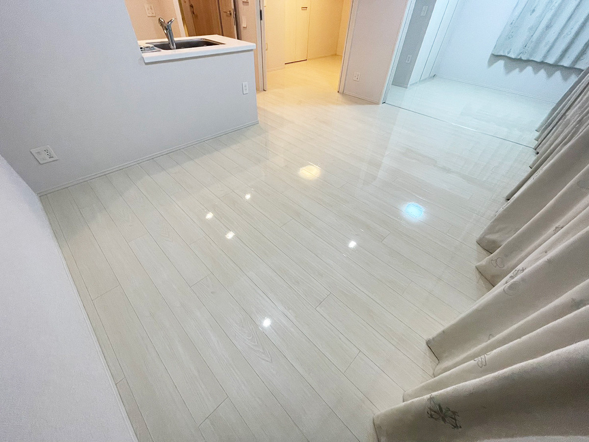 この施工によって適度なグロス感のある美しい床に生まれ変わり、滑りにくく傷にも強い仕上がりとなりました。