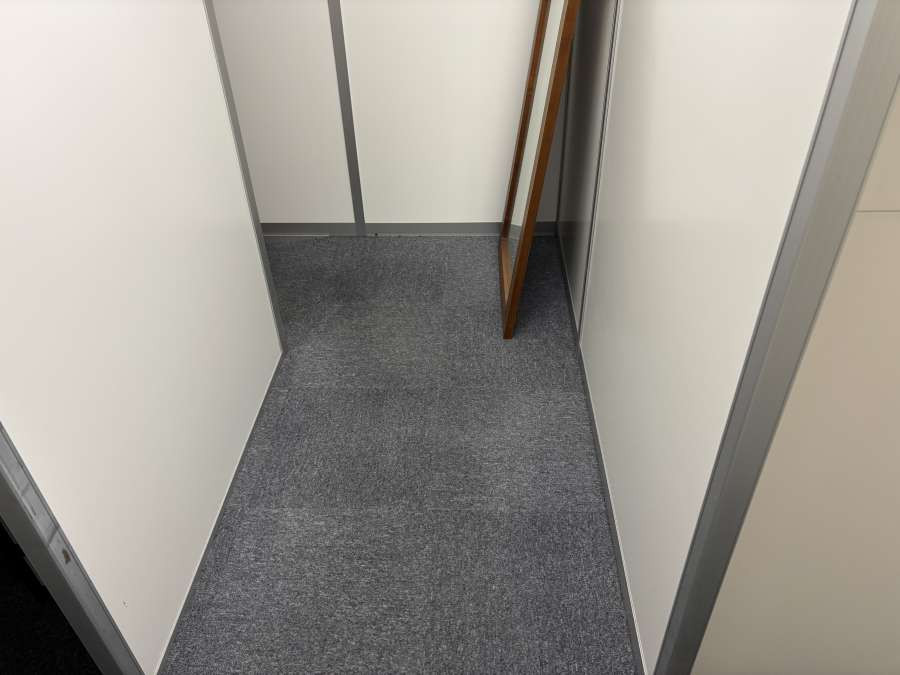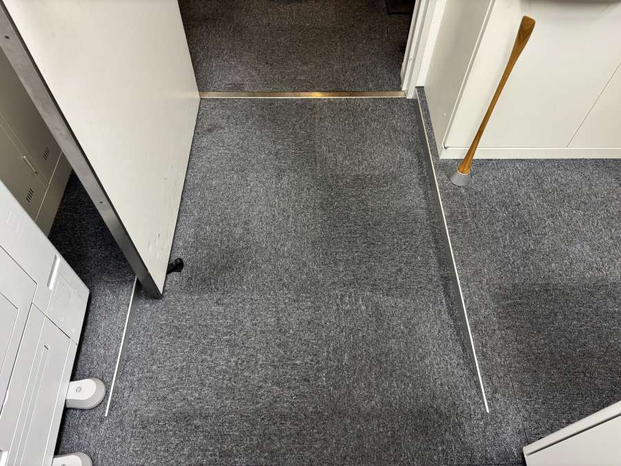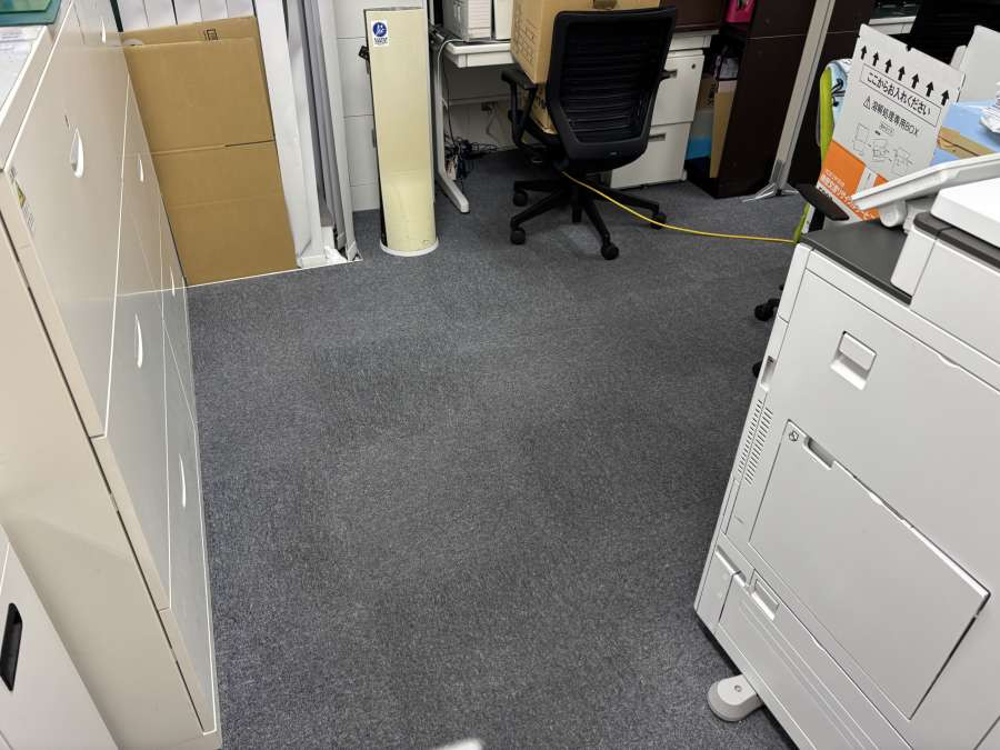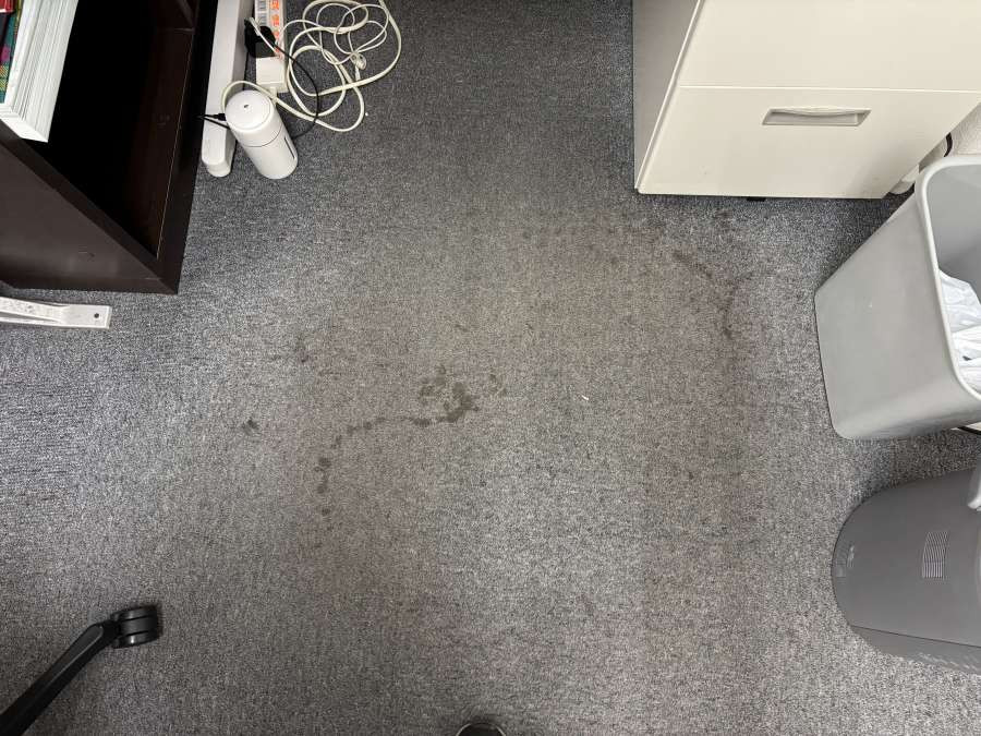 現調当日、事務所は約40㎡のタイルカーペット敷きで、入口で靴を脱ぐ土足禁止の環境でした。表面に泥汚れこそ少ないものの、長年の歩行で繊維が押し固められた部分は黒ずんでおり、特にデスク下やコピー機前など体重のかかる箇所に汚れの集中が見られました。開業以来一度も専門業者による洗浄はしておらず、繊維内部には沈着汚れが進行している様子です。