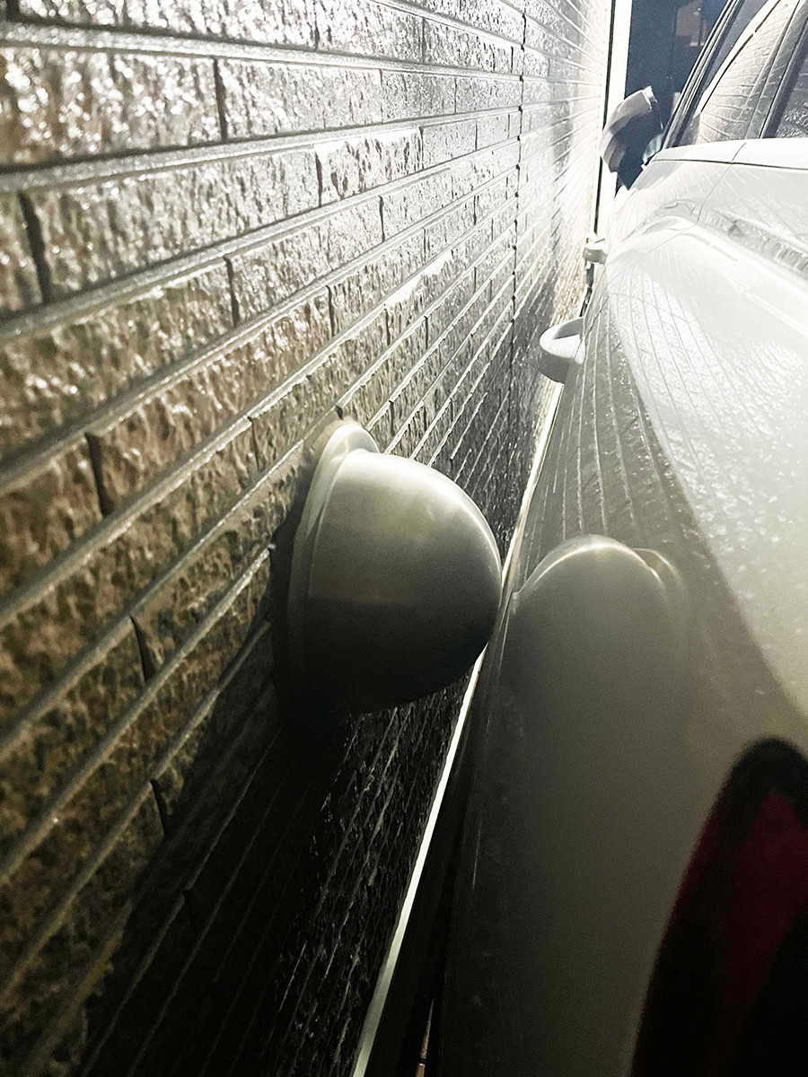 周囲構造は、上部に小さな庇、横に雨樋、足元は狭い通路で、作業中に通行者が近づきやすい条件でした。