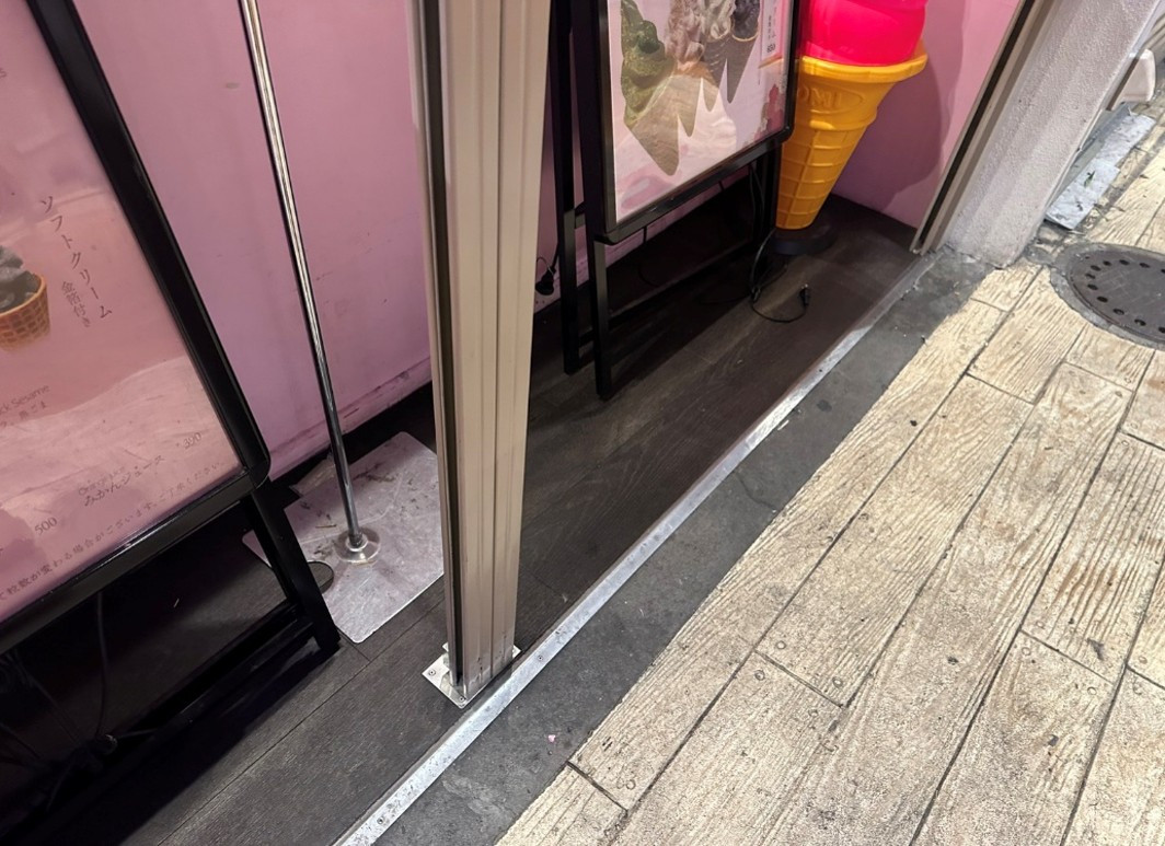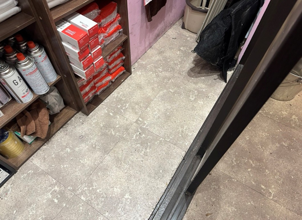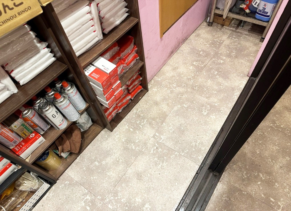 店内は石の床(硬質床相当)で、ヒールマークのようなゴム跡と、動線に沿った黒ずみ(油+土砂の複合)が目立ちました。
