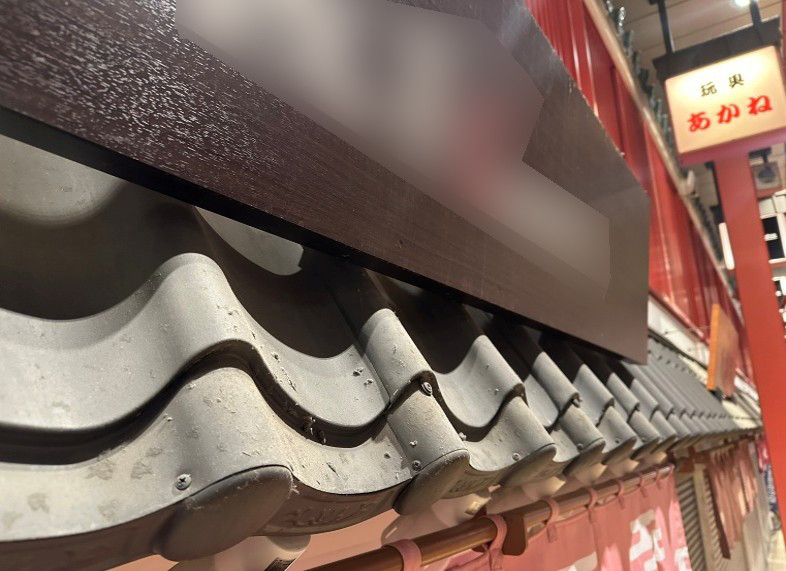 入口まわりの外観は、瓦状の意匠部が灰色のホコリで覆われ、茶色の看板もくすんで見える状態でした。