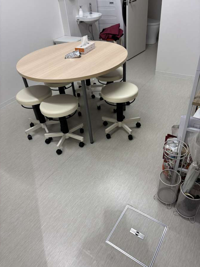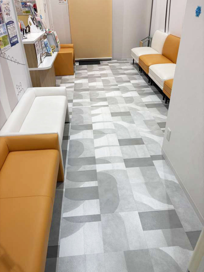床材は塩ビ系の床で、待合はグレーと白の模様、診察室と事務所は白ベース(場所によって木目)でした。