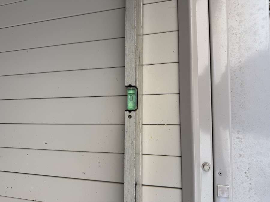 最後に物置を落ち着かせ、四隅と中央付近で気泡を見て、ガタつきがない状態まで合わせ込みました。