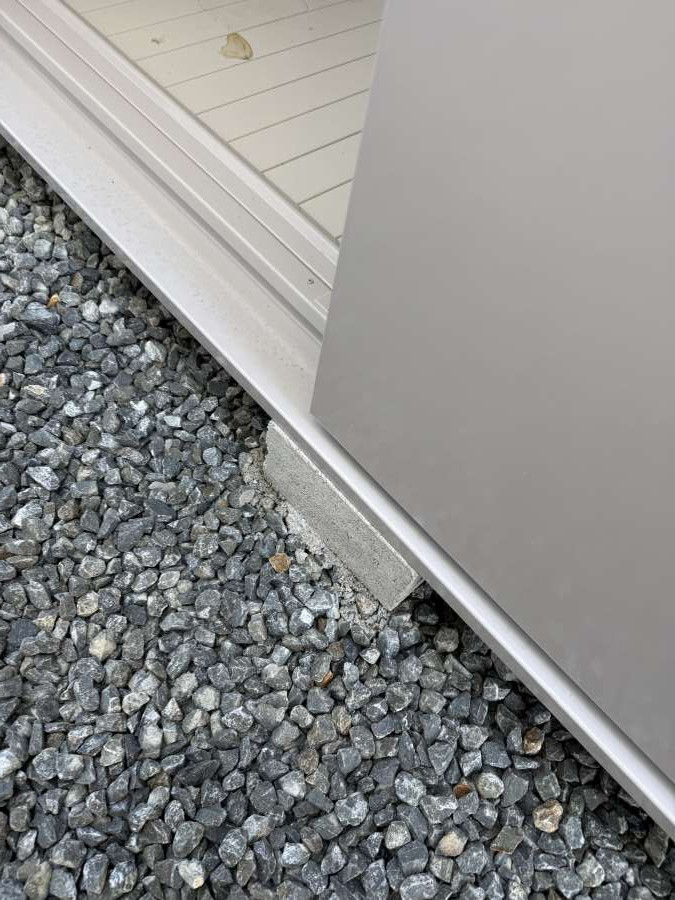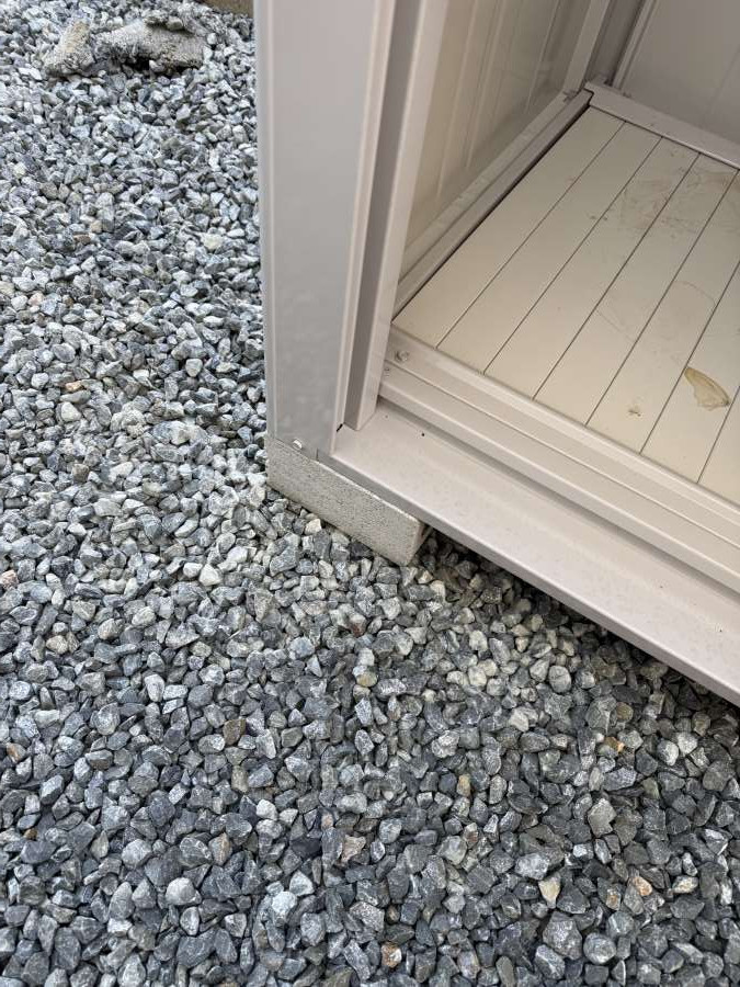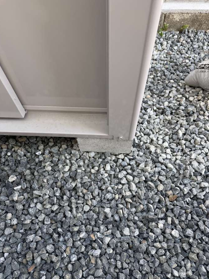 三つ目は、地面がグレーの砂利で、物置の下に塀ブロックが複数置かれていることです。